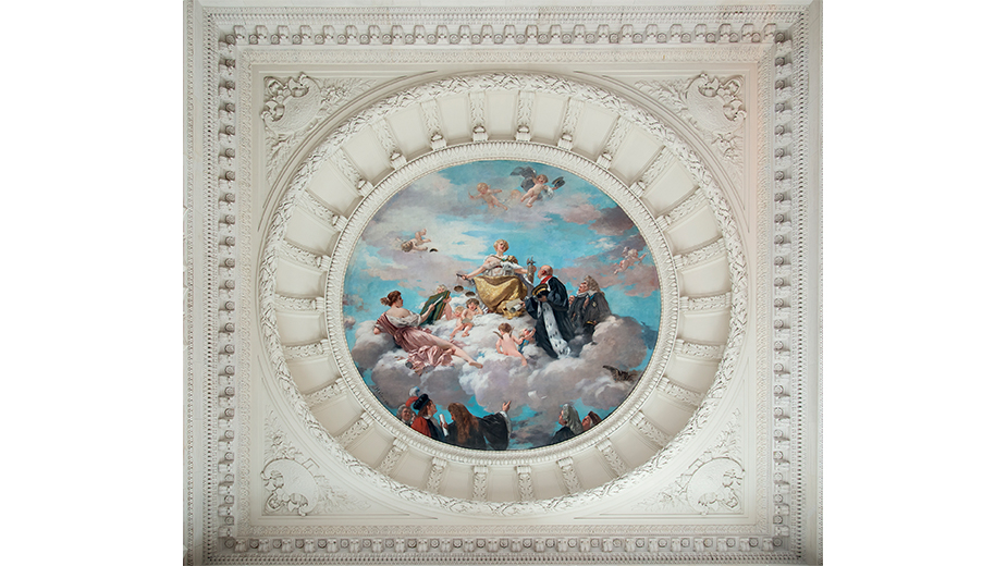 Le plafond est orné d’une décoration circulaire peinte par Henri Gervex en 1910. Le Premier président Hérault remet un manuscrit à l’allégorie de la Justice, tandis que l’allégorie de l’Histoire consigne l’événement, sous le regard de magistrats de la Cour anciens et contemporains. Un hibou symbolise sagesse et vigilance dans l’obscurité.