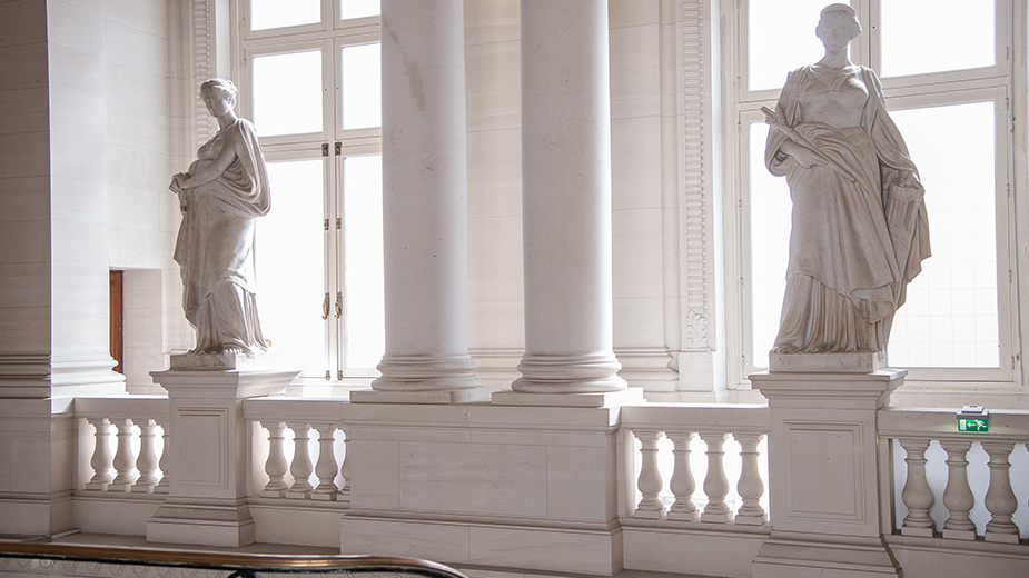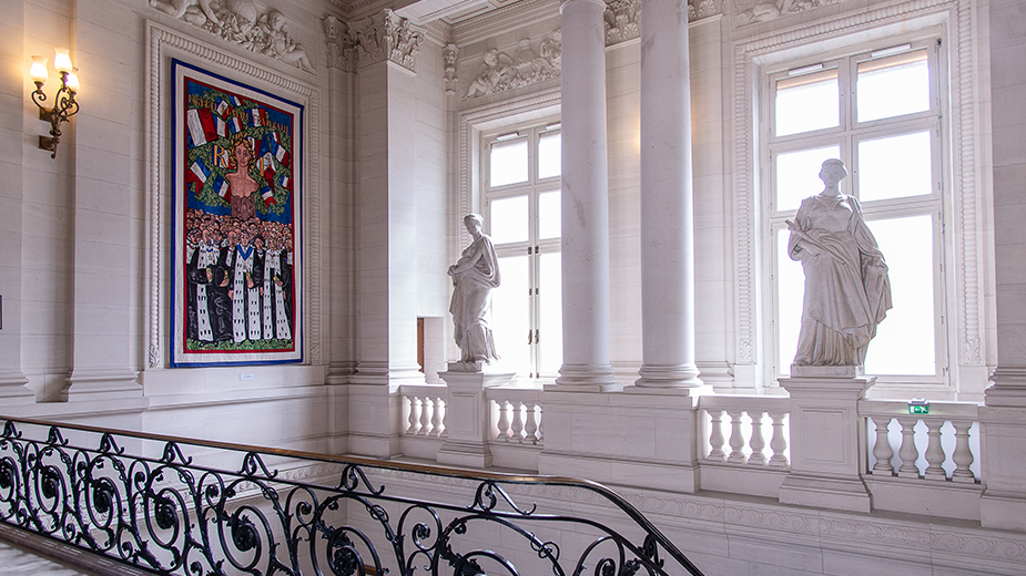 Deux statues dues à Henri Vernhes, face au palier du deuxième étage, symbolisent la Loi et la Justice (à droite, munie d’un sceptre).