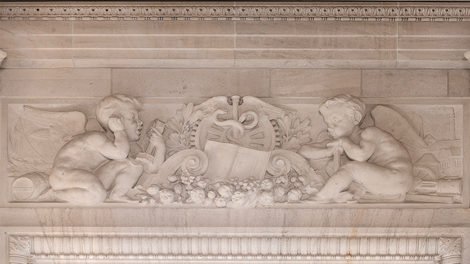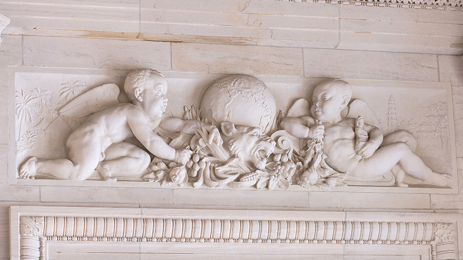 Les trumeaux illustrent des domaines d’activité de l’administration sur lesquels la Cour exerce ses contrôles : l’agriculture, la médecine, les sciences, la guerre, la marine, les arts, la justice et le commerce.