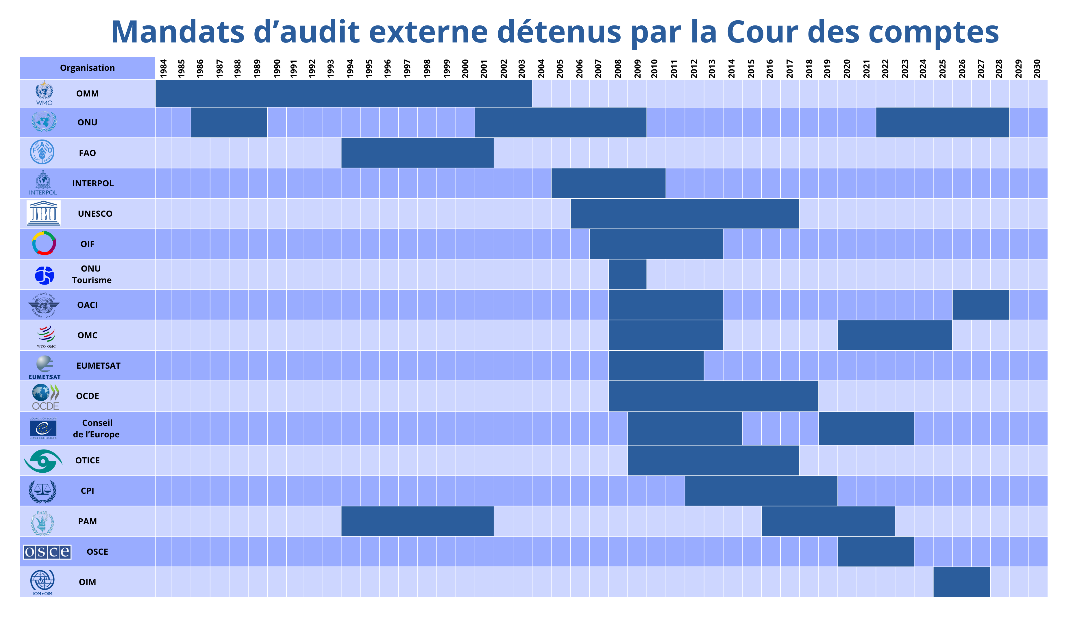 Depuis quarante ans, la Cour a assuré en continu l'audit externe d'au moins une organisation liée aux Nations unies. Voici la liste des organisations internationales qui ont confié au moins une fois à la Cour des comptes un mandat d’audit externe :